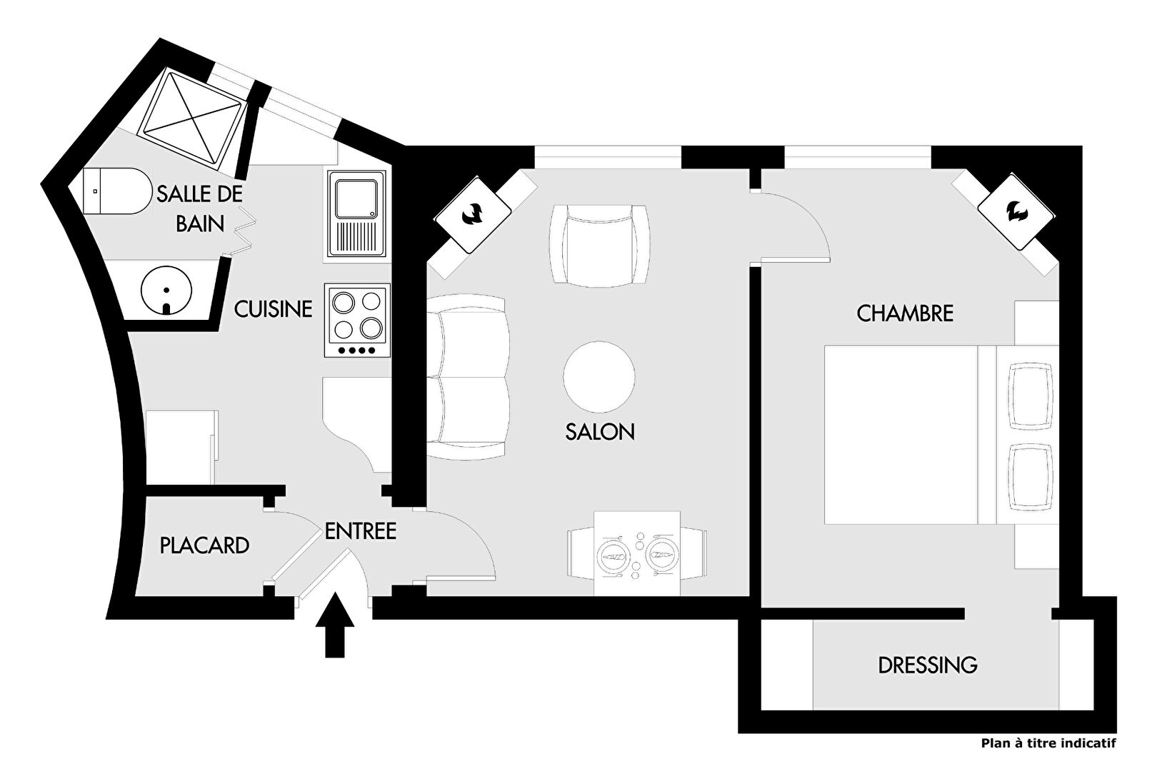 Il comprend : entrée, séjour, cuisine indépendante (possibilité US), salle de bains avec wc, chambre et cave en sous-sol.