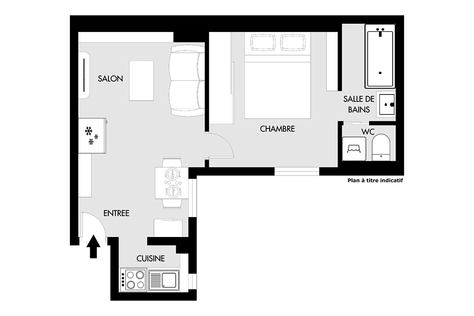 Il comprend : un séjour, une cuisine ouverte aménagée et équipée, une chambre, une salle de bains avec wc.