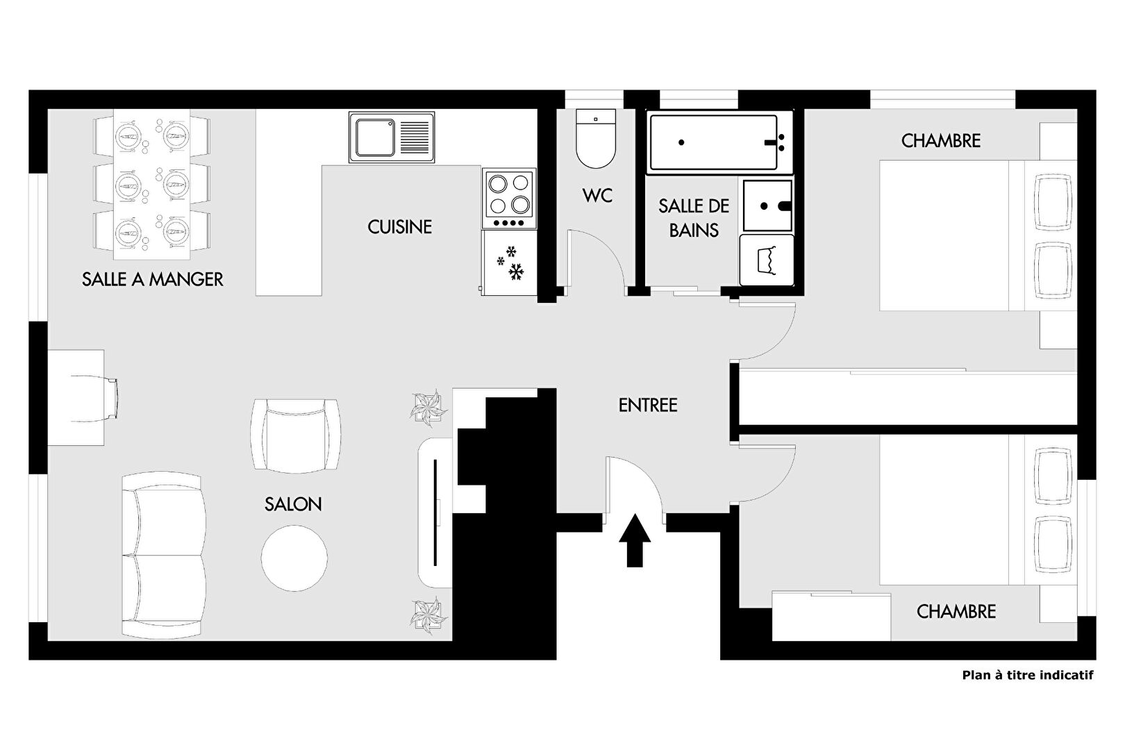 Il se compose d’une entrée avec rangements, d’un séjour avec une cuisine ouverte aménagée et équipée, d’un wc indépendant, d’une salle de bains, de deux chambres et d’une cave en sous-sol.
